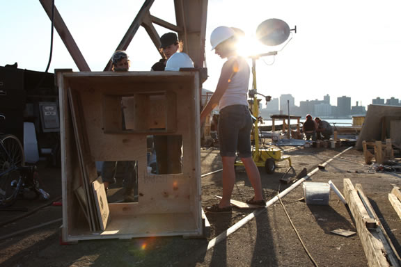 Artist Geneviève Rousseau building the Smithsonian Chicken Coop at the GMD Shipyards in the Brooklyn Navy Yard, with Waterpod Living Systems Team Director and Artist Carissa Carman and Meg Glaser, picture by Mira Hunter.