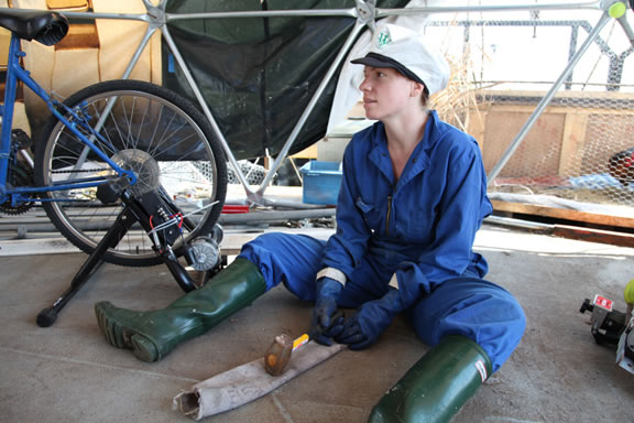 < | chickens | > Mira Hunter filling a length of old fire hose with the oyster shells and crushing them with a sledge hammer, picture by Derek Hunter.