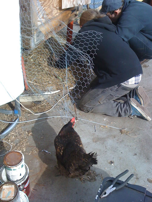 < | Chickens | > Ian Daniel and Tighe Lanning deconstructing the coop, while Rizzo looks on.
