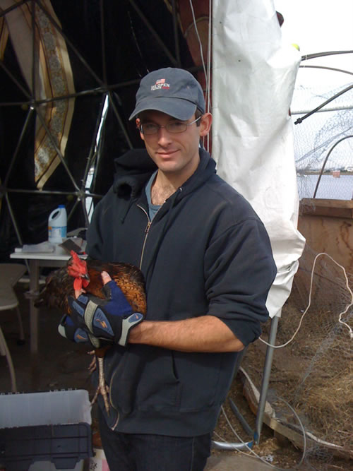 < | Chickens | > Volunteer Tighe Lanning cradling one of our lovely ladies.