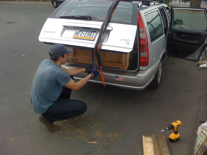 Volunteer Tighe Lanning packing up the chicken coop in the back of his vehicle.